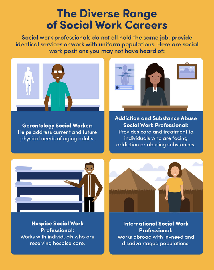 - Racism and inequality: Social workers can raise awareness about the harms of racism and intolerance toward or among certain populations. They can also work with individuals whose lives are impacted by inequality in some way, such as lack of equal job opportunity or discrepancies in pay among members of certain genders and ethnic groups.